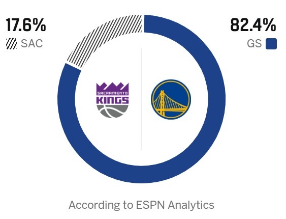 ESPN预测本场比赛胜率,勇士82.4%,国王17.6%。